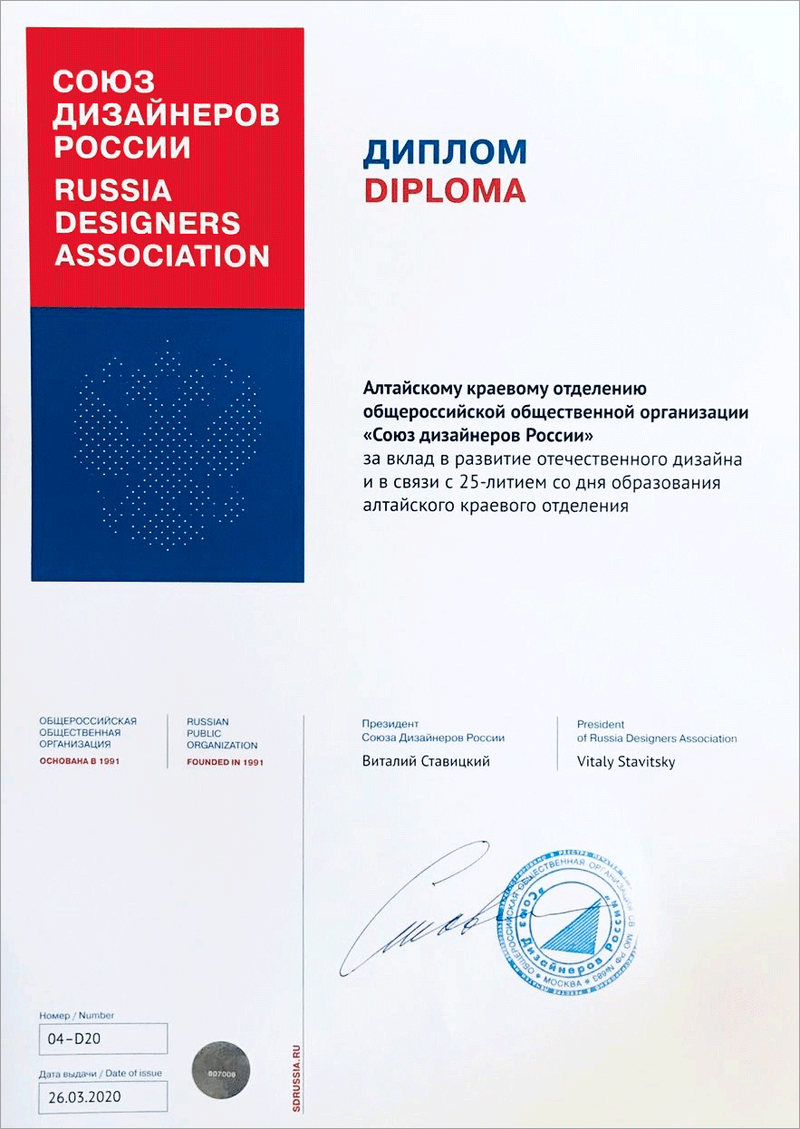 17 мая 2020 года исполняется 25 лет со дня основания Алтайского краевого отделения Общероссийской общественной организации «Союза дизайнеров России». К сожалению отпраздновать эту прекрасную дату нам всем вместе пока не удаётся, в связи с карантинными мерами. Все юбилейные мероприятия переносятся на конец года.